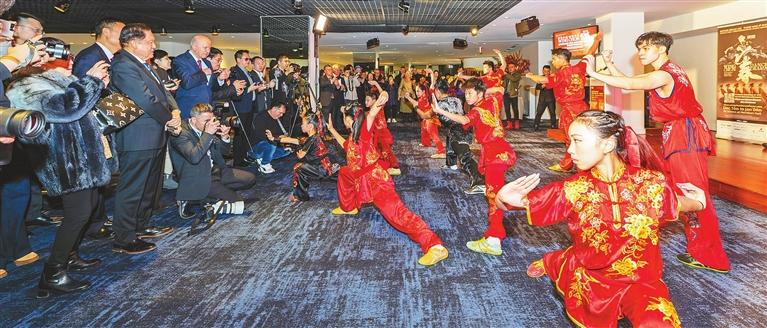 현지 시간으로 화요일, 토론토 메리디언 홀에서 열린 선전의 도시 이미지 홍보 행사에서 관객들이 전통 무술 시범을 선보이는 공연자들을 집중해서 지켜보고 있다. 저우 훙성